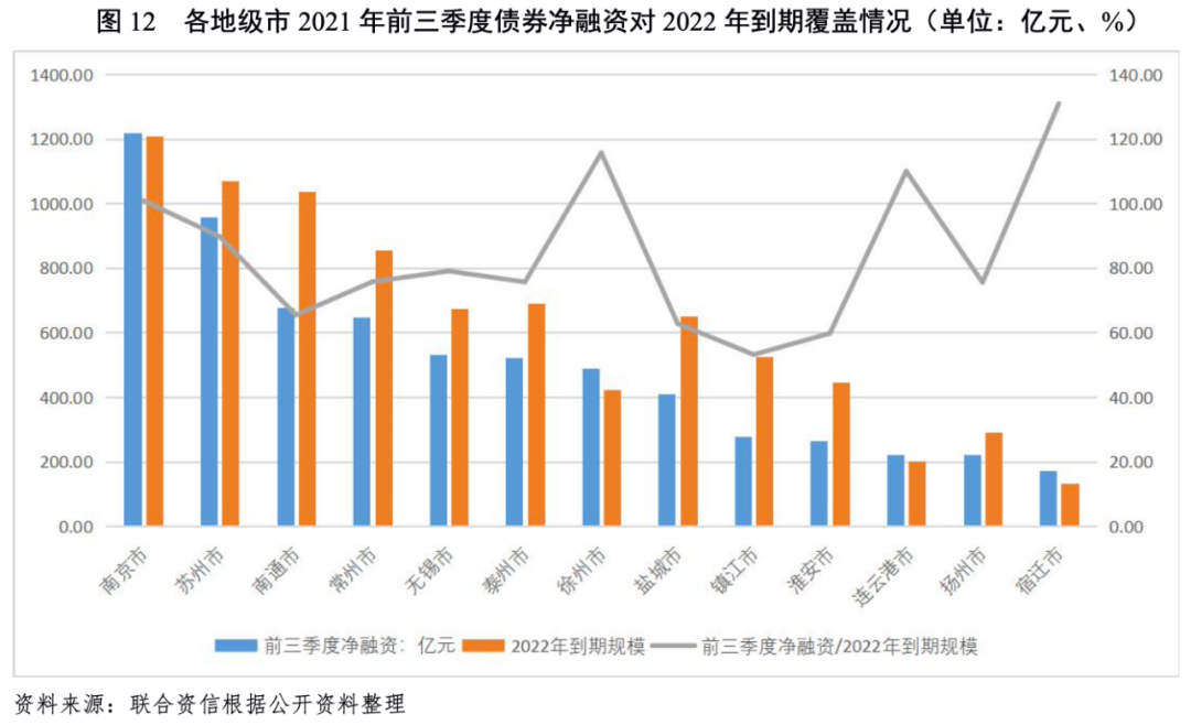 從2021年前三季度債券凈融資對2022年到期債券覆蓋程度來看,江蘇省2022年按行權統計到期債券規模合計8201.97億元,2021年前三季度發行規模為其80.66%,覆蓋情況較好。同期,各地市中覆蓋程度位居前三的為宿遷市、徐州市和連云港市,分別為130.99%、115.69%和110.00%;鎮江市、淮安市和鹽城市覆蓋程度較低,分別為53.15%、59.72和62.77%。