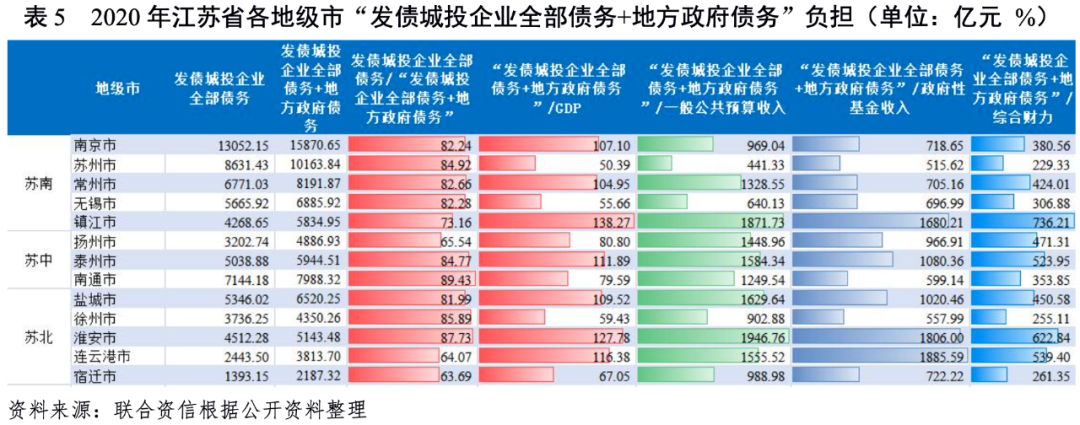 從“發債城投企業全部債務+地方政府債務”規模看,蘇南地區整體高于蘇中和蘇北地區各地級市。截至2020年底,南京市“發債城投企業全部債務+地方政府債務”規模最大,蘇州市位列其后,規模第3~5位由高至低依次為南通市、常州市和無錫市,宿遷市“發債城投企業全部債務+地方政府債務”規模最小,為2187.32億元。