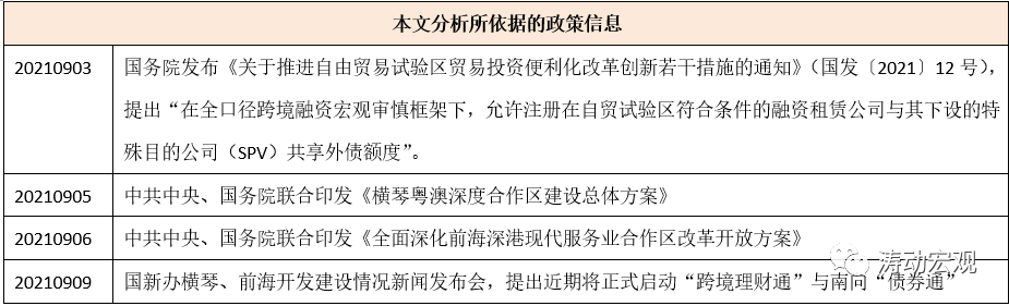 2021年9月5日與6日發布的兩個《方案》明確了兩大合作區未來15年(兩個方案均展望至2035年)的發展目標與舉措,里面提出的一系列支持政策預計后續還會有相關配套細則出臺,如9月9日央行副行長潘功勝便透露“央行正牽頭港澳金融管理部門制定金融支持兩地改革開放的專門文件”。同時考慮到廣州南沙新區、深圳前海蛇口以及珠海橫琴新區均屬于廣東自貿區,因此這里將《關于推進自由貿易試驗區貿易投資便利化改革創新若干措施的通知》納入進來。