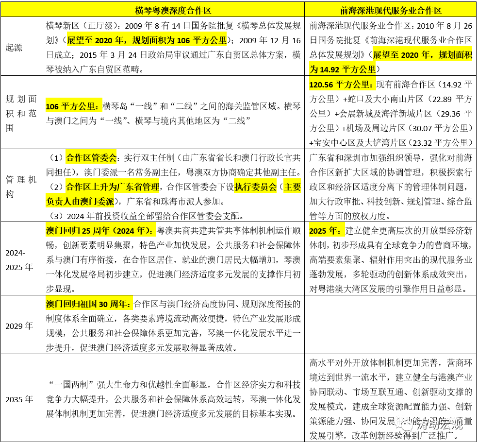 但有它們之間一些差異,主要體現在橫琴粵澳深度合作區的行政層級明顯提升(名義上升為廣東省管理、實際上澳門方面的權限更大),即橫澳合作區可以被看作是澳門島的擴容、實際上是以澳門為主在管理;深港合作區則是原前海合作區的擴容,主要為原前海合作區相關政策的平移、仍延續現行管理模式。