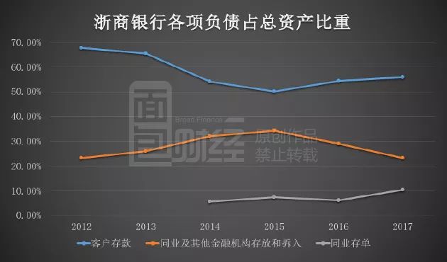 目前,同業(yè)存單和同業(yè)存款這兩項(xiàng)同業(yè)負(fù)債合計(jì)占浙商銀行總資產(chǎn)的比重為33.6%,而這一比重在2015年更是高達(dá)41.71%。