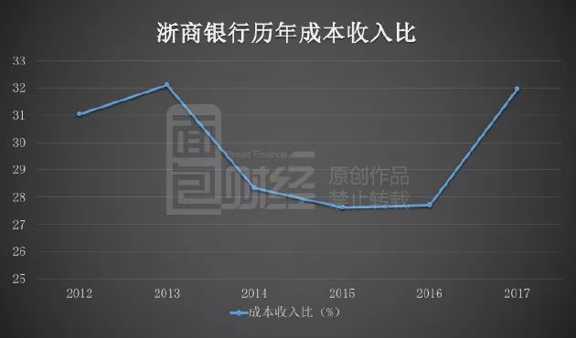 成本收入比是反應(yīng)銀行成本控制的一個(gè)重要指標(biāo),在經(jīng)過前幾年的持續(xù)改善后,浙商銀行2017年成本收入比的攀升十分明顯: