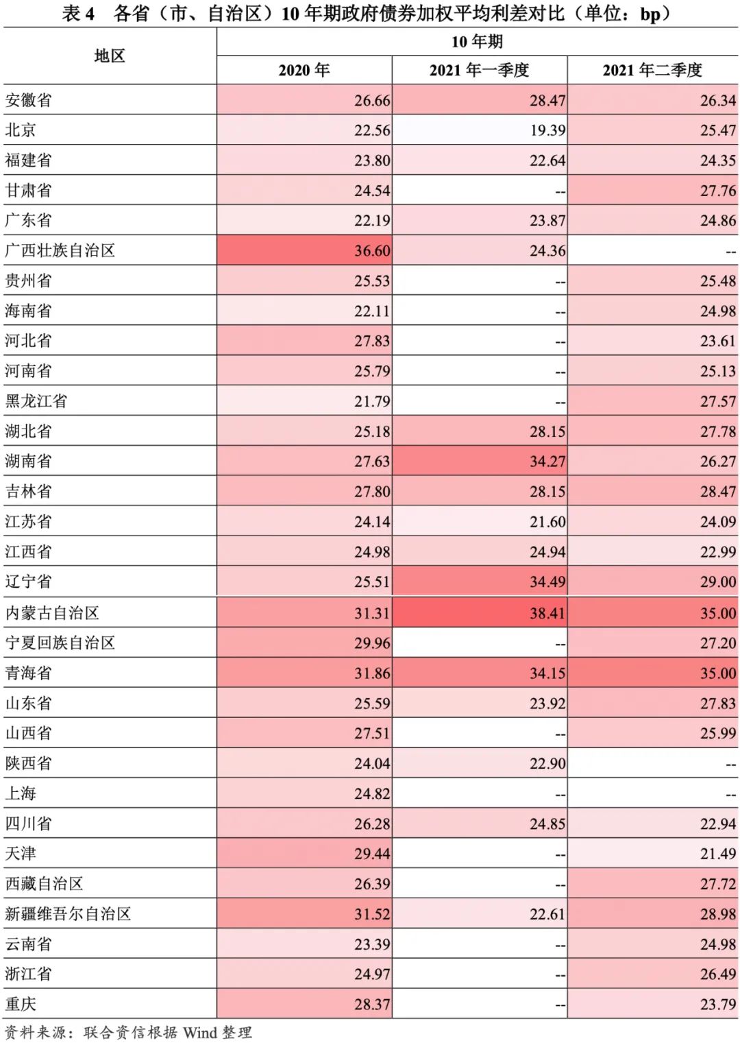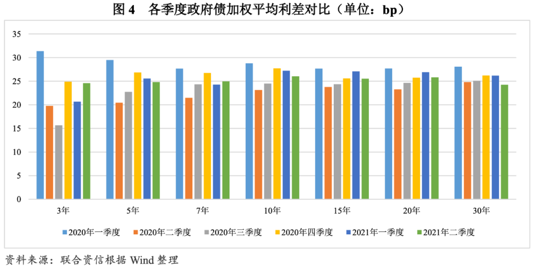 發(fā)行利差走勢有所分化,中長期品種的區(qū)域利差有所擴大。發(fā)行利差方面,以同期限中債國債到期收益率為基準(zhǔn),2021年一季度,10年及以下期限政府債券加權(quán)平均利差環(huán)比均有所下降,15年及以上期限政府債券加權(quán)平均利差環(huán)比有所上升或保持相對穩(wěn)定;2021年二季度,除3年和7年政府債券外,其他期限政府債券加權(quán)平均利差環(huán)比均有所下降。分區(qū)域看,2020年以來,青海省和內(nèi)蒙古自治區(qū)發(fā)行的中長期品種利差顯著高于其他區(qū)域;一季度,區(qū)域分化較上年度明顯走闊;二季度,中長期品種的區(qū)域利差有所收斂。與2020年相比,有近一半省(市、自治區(qū))2021年二季度政府債券發(fā)行利差有所下降,其中天津市、重慶市和河北省發(fā)行利差降幅均超過4bp,天津市最高為7.95bp;黑龍江省、內(nèi)蒙古自治區(qū)、遼寧省、甘肅省和青海省發(fā)行利差增幅超過3bp。