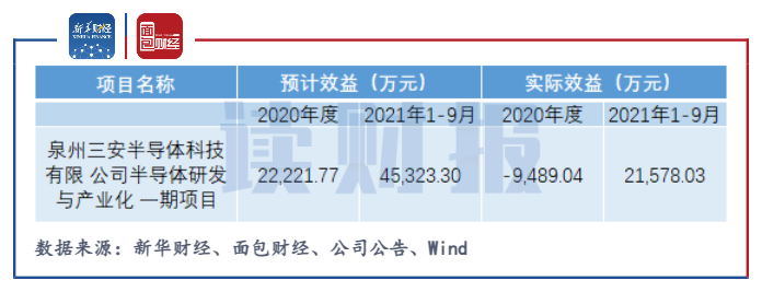 2020年度、2021年1-9月泉州三安一期項目預計收益分別為2.22億元、4.53億元,實際收益為-0.95億元、2.16億元,與預期收益相差較遠。截至三季度末,公司另外兩個重要在投項目湖南三安項目和湖北三安項目暫未盈利,合計虧損4833.27萬元。
