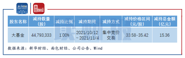 就在公司發布非公開發行股票預案后的一個月多內(10月12日至11月4日),大基金通過集中競價交易方式減持公司股份4479.33萬股,占總股本的1%。減持價格區間在33.58元/股-35.42元/股,套現近15.36億元。大基金此次計劃減持近8959萬股,截至11月4日,大基金減持計劃實施過半,未來仍有可能會減持。