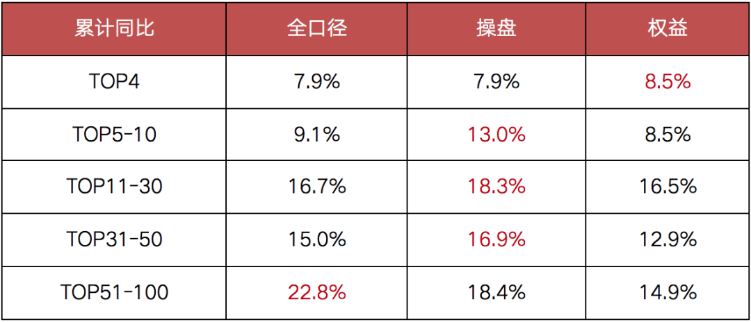 一方面,TOP50房企更注重自身規(guī)模的高質(zhì)量發(fā)展,2020年TOP50各梯隊(duì)的操盤業(yè)績(jī)?cè)鏊佥^全口徑都較高。而對(duì)于TOP51-100梯隊(duì)房企,業(yè)績(jī)規(guī)模仍處于企業(yè)戰(zhàn)略發(fā)展的重要位置。年內(nèi)中小規(guī)模房企更多地通過(guò)項(xiàng)目合作謀求全口徑業(yè)績(jī)的增長(zhǎng)空間,全口徑業(yè)績(jī)?cè)鏊龠_(dá)22.8%,顯著高于操盤和權(quán)益口徑。