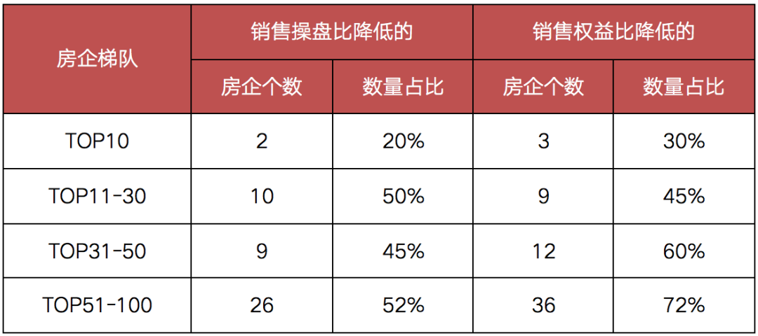 另一方面,當(dāng)前市場(chǎng)背景下,隨著更多的中小規(guī)模企業(yè)通過(guò)合作開(kāi)發(fā)提升全口徑業(yè)績(jī)規(guī)模,其整體的項(xiàng)目操盤和權(quán)益比例也相應(yīng)降低。2020年在TOP51-100梯隊(duì)房企中,銷售操盤比、銷售權(quán)益比降低的房企個(gè)數(shù)為26家和36家,占比分別達(dá)到52%和72%且高于其他梯隊(duì)房企。