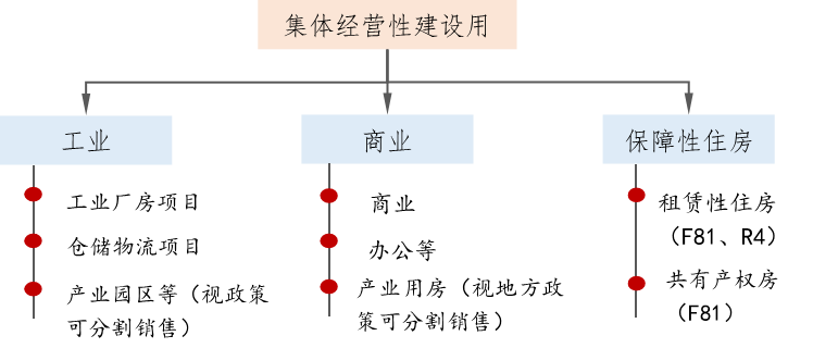 根據《土地管理法》修訂內容可知,目前法律所允許的入市用途僅為工業、商業等經營性用途,并未明確涉及住宅類用途。關于住宅類項目應用目前存在以下兩種嘗試: