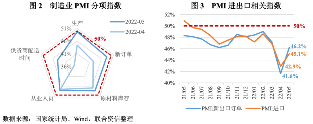 第一,制造業產需兩端出現探底企穩跡象,但供應鏈物流復蘇依然較慢。5月制造業PMI的五個主要分項指數均繼續低于枯榮線,其中生產指數為49.7%,較上月上升5.3個百分點,表明制造業生產收縮幅度較上月顯著收窄,出現觸底企穩跡象;新訂單指數為48.2%,較上月上升5.6個百分點,表明制造業市場需求收縮幅度較上月收窄,但收縮情況依然較為明顯;原材料庫存指數為47.9%,較上月上升1.4個百分點,表明制造業主要原材料庫存量繼續收縮,收縮幅度較上月略有收窄;從業人員指數為47.6%,較上月上升0.4個百分點,表明制造業企業用工水平繼續下降,下降幅度較上月基本持平;供應商配送時間指數為44.1%,較上月上升6.9個百分點,雖然景氣度下降幅度較上月明顯減小,但依然處于顯著收縮水平,表明供應鏈物流繼續受疫情防控影響,制造業原材料供應商交貨時間仍然較慢。