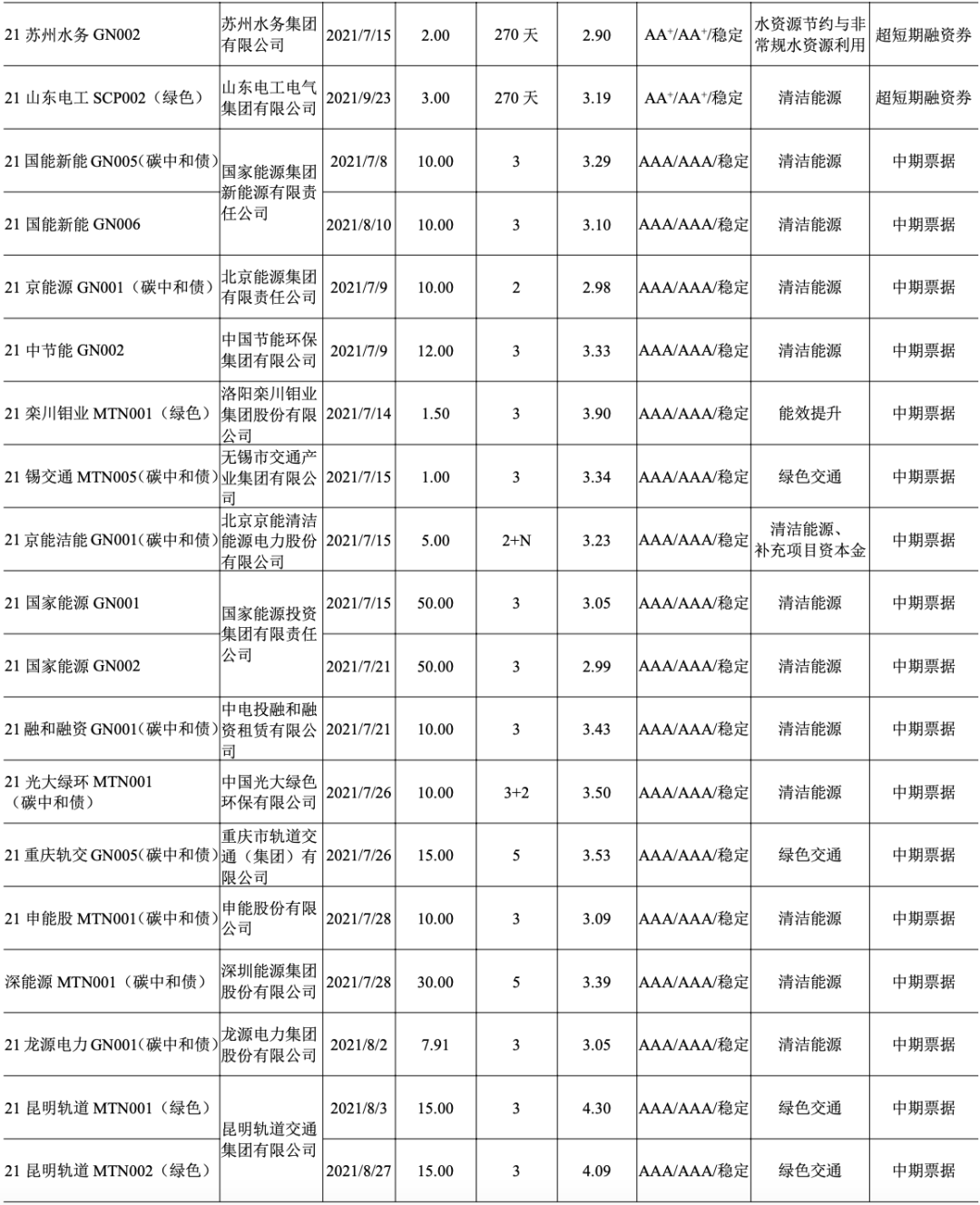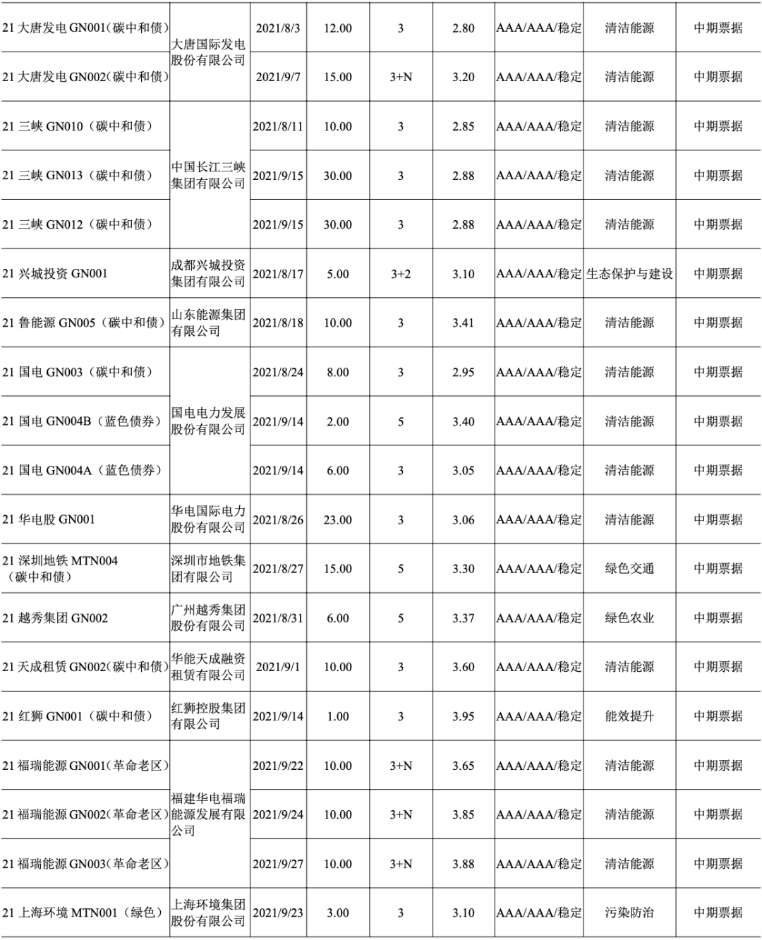 2021年8月31日,南方電網(wǎng)公司發(fā)行“南網(wǎng)融資租賃公司2021年度融資租賃第一期綠色資產(chǎn)支持商業(yè)票據(jù)(ABCP)”,發(fā)行規(guī)模16億元,票面利率2.58%,發(fā)行期限120天,募集資金將用于風(fēng)力和光伏發(fā)電項(xiàng)目。該債券系全國(guó)首只公募碳中和資產(chǎn)支持商業(yè)票據(jù),據(jù)綠色評(píng)估機(jī)構(gòu)測(cè)算,本期票據(jù)募集資金用于碳減排項(xiàng)目,將實(shí)現(xiàn)年減碳排量114.47萬(wàn)噸。(摘自中國(guó)新聞網(wǎng),2021年8月31日)