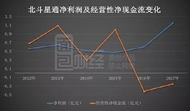 盡管,北斗星通凈利潤大幅飆升,但公司的經(jīng)營性凈現(xiàn)金流卻已經(jīng)持續(xù)兩年為負:2016年及2017年,公司經(jīng)營性凈現(xiàn)金流分別為負的約0.42億及約0.25億。