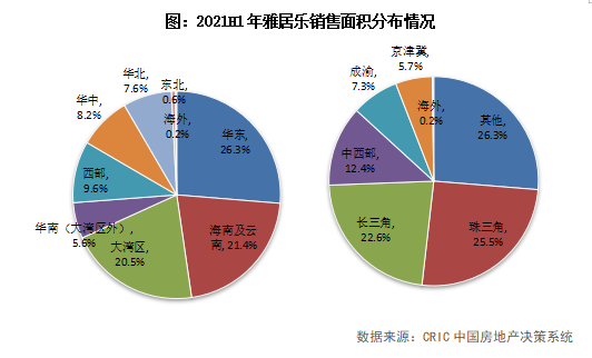 華東區域貢獻最大,戰略深耕城市群銷售占比過半。2021年上半年,雅居樂預售貢獻來自逾80個城市215個項目。從區域分布來看,華東區域貢獻最大,銷售面積占比26.3%,相比2020年末提升3.4個百分點。其次是華南區域,占比總計26.1%,其中大灣區達20.5%。海南和云南總銷售占比也提升至21.4%。從城市群分布來看,“2+3+N”城市群策略成效明顯,珠三角和長三角城市群作為戰略深耕城市群,貢獻率達48%。