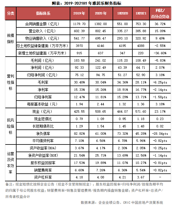 【營收同比增長15%,盈利能力尚屬穩健】上半年營業收入為385.88億元,同比增長15.1%。當前合同負債規模有限,為保證營收穩定,動態調整推盤節奏,會考驗企業的研判能力和應變能力。毛利率為28.1%,同比下降6.3個百分點。2021年上半年企業獲取土地成本增加,當前總土儲成本由2020年的3627元/平方米上升至3700元/平方米。