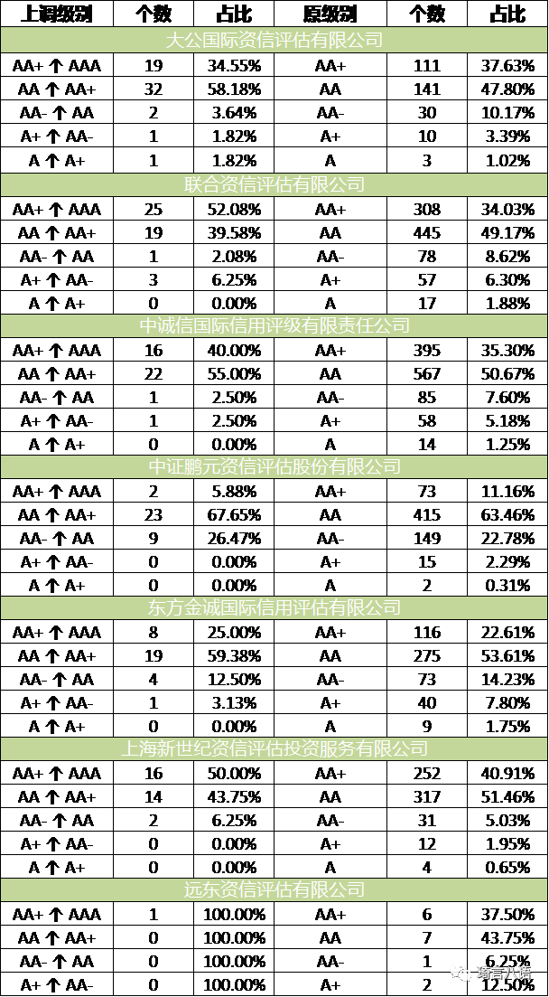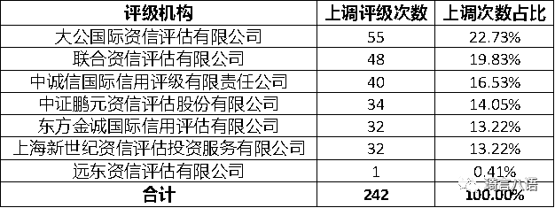 通過對主體評級上調數據中的評級機構進行統計分析,見下圖: