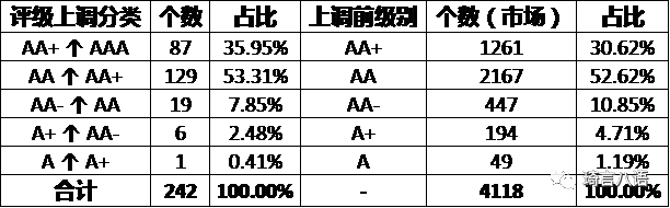 可以看出,242個評級上調中,從AA上調到AA+的占比最多,高達53.31%,其次是從AA+上調至AAA的,占比35.95%。該結構與全市場中AA及AA+在[A、A+、AA-、AA、AA+]5個級別中的占比類似。也就是說,今年主體評級的上調是全市場整體的上移,對于各級別而言,差異不大。當然,最終導致市場中AA+及AAA等高級別占比越發集中了