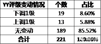 其次,查詢上述221個主體在2020年1月1日至2020年9月20日期間的YY評級變動情況,發現下調19家,無變動189家,上調僅13家,占比不到6%,詳見下圖: