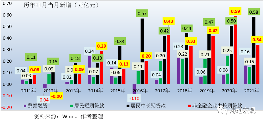 1、受限電限產(chǎn)、疫情多點(diǎn)擴(kuò)散等因素影響,企業(yè)中長(zhǎng)期貸款需求仍然延續(xù)10月的弱勢(shì),同比明顯少增。今年11月,企業(yè)中長(zhǎng)期貸款新增0.34萬(wàn)億,同比大幅少增0.25萬(wàn)億(10月同比少增0.19萬(wàn)億元),表明實(shí)體經(jīng)濟(jì)融資需求不足,資產(chǎn)荒問題較為突出。實(shí)際上,今年7-11月,企業(yè)中長(zhǎng)期貸款同比均明顯少增(合計(jì)少增1.12萬(wàn)億元)。