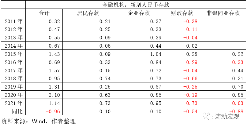 今年11月當(dāng)月,居民存款與企業(yè)存款分別新增0.73萬(wàn)億和0.95萬(wàn)億,同比分別多增0.10萬(wàn)億和0.10萬(wàn)億,創(chuàng)歷年11月新增最高。與此同時(shí),財(cái)政存款與非銀同業(yè)存款10月當(dāng)月分別少增0.54萬(wàn)億元和0.88萬(wàn)億元,反映出政府債券發(fā)行、投資支出增加以及非銀體系流動(dòng)性下降等因素。