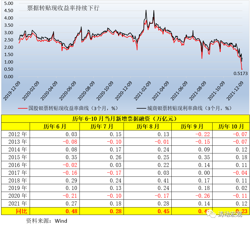 1、今年6月、7月、8月、9、10月和11月當(dāng)月新增票據(jù)融資分別達(dá)到0.27萬(wàn)億、0.18萬(wàn)億、0.28萬(wàn)億、0.14萬(wàn)億、0.12萬(wàn)億和0.16萬(wàn)億元,同比分別多增0.49萬(wàn)億、0.28萬(wàn)億、0.45萬(wàn)億、0.40萬(wàn)億、0.23萬(wàn)億和0.03萬(wàn)億,也就是說(shuō)6-11月期間票據(jù)融資累計(jì)多增了1.87萬(wàn)億。這其中的背景便是,3個(gè)月銀票轉(zhuǎn)貼現(xiàn)收益率持續(xù)下行,特別是10月以來(lái)已累計(jì)下行200BP至0.50%附近。