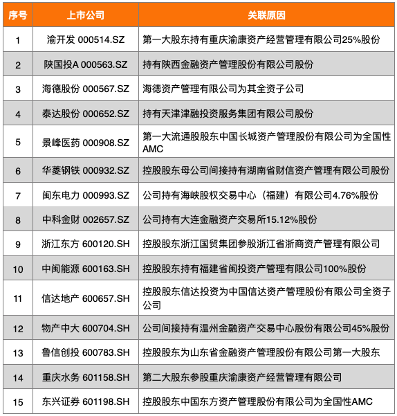 AMC概念上市公司15家,8家在深交所上市,7家在上交所上市,其中海德股份(000567.SZ)為A股唯一全資地方性AMC標的。