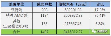 從阿里拍賣平臺中篩選出浙江地區(qū)債權(quán)(超過1000萬)成交記錄,總成交戶數(shù)1497戶,成交債權(quán)總本金341.6億,總成交價157.8億元,其中持牌AMC出讓比重接近80%。