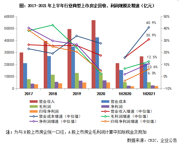 具體來看,2021年上半年行業80家典型上市房企1整體實現營收收入26839億元、營業成本21039億元,營收和營業成本的增速中位值分別為30.9%和40.9%。雖然從數值上看,營收增幅較去年同期有明顯回升且處在歷年較高水平,但這主要是因為2020年上半年受疫情影響,項目竣工及交付結轉普遍延遲、收入無法如期確認、上半年整體結算基數較低。