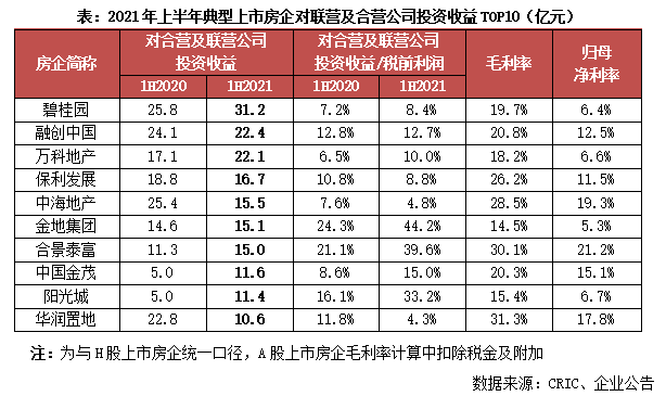 2021年,隨著樓市調控的持續收緊,針對房企的“三道紅線”、針對房貸的“兩條紅線”,以及“集中供地”政策的落地,房企面臨更為嚴峻的外部環境,繼而合作趨勢進一步強化,以對沖調控風險、優勢互補提升競爭力。對于房企合作中的非并表項目而言,其開發利潤以權益法進行核算,計入“對聯營及合營企業投資收益”科目,影響凈利潤表現。同時,合作非并表項目的增加也會相應地提升企業的歸母凈利率水平。