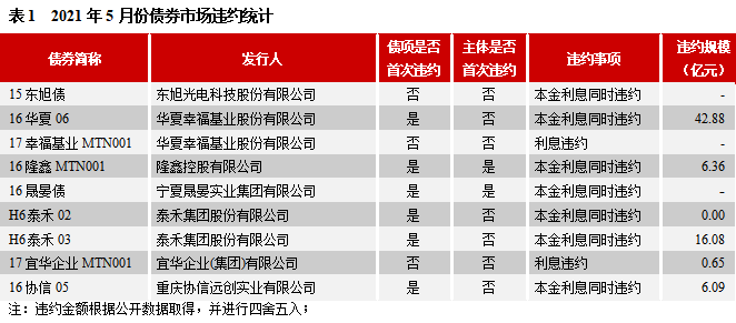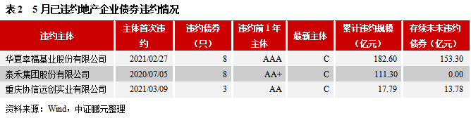 2021年5月,已違約主體泰禾集團股份有限公司(簡稱“泰禾集團”)、華夏幸?;鶚I股份有限公司(簡稱“華夏幸福”)和重慶協信遠創實業有限公司(簡稱“重慶協信”)的存續債券繼續出現違約。截至2021年5月末,華夏幸福尚有存續債券153.30億元,其中有33億元在2021年面臨到期或回售;重慶協信尚有存續債券13.78億元,在7月和9月到期;泰禾集團所有發行債券均已到期或違約。