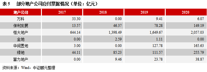 商業票據,在房地產行業不僅是一種支付工具,也是一種重要的融資工具,一般不計入有息負債。商業票據的簽發和支付高度依賴于企業自身的信用,一定程度上反應出企業在產業鏈中的地位及議價能力。房地產企業屬于產業鏈下游,有較強的議價能力,所以,應付票據多為大型房企對外支付工程款和材料款等,或實現變相融資(票據額度超過實質的交易額度)。恒大地產的應付票據規模顯著高于其他企業,同時年度規模呈現明顯增長。