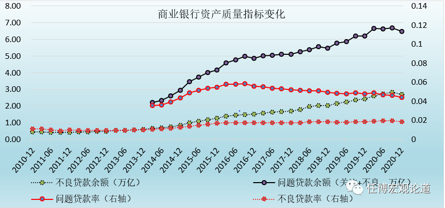 1、2012年以來,我國(guó)商業(yè)銀行資產(chǎn)質(zhì)量開始趨于惡化,不良貸款余額增至2.70萬億元、問題貸款余額亦相應(yīng)增至6.48萬億,不良貸款率提升至1.84%。若不考慮2020年的延期還本付息等政策,則目前我國(guó)不良貸款余額和不良貸款率將分別為3萬億和2%以上。