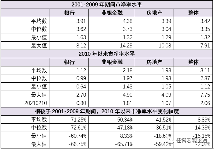 以平均數(shù)為例,整體A股市場(chǎng)的市凈率從2001-2009年期間的3.42倍降至2010年以來的3.11倍,下降幅度達(dá)8.89%。與之相對(duì)應(yīng),銀行、非銀金融與房地產(chǎn)在此期間的市凈率下降幅度亦分別達(dá)到71.25%、50.34%和41.52%。