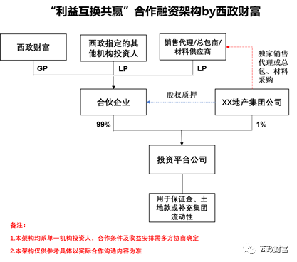 西政作為GP與總包商/材料供應商/房產銷售代理商以及其他機構投資人共同成立合伙企業。