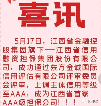 根據合肥市興泰融資擔保集團有限公司(以下簡稱“合肥興泰擔保”)2022年5月24日的公告信息,東方金誠國際信用評估有限公司將公司的主體信用等級由AA+調升至AAA。合肥興泰擔保成為了安徽省第二家AAA擔保公司。
