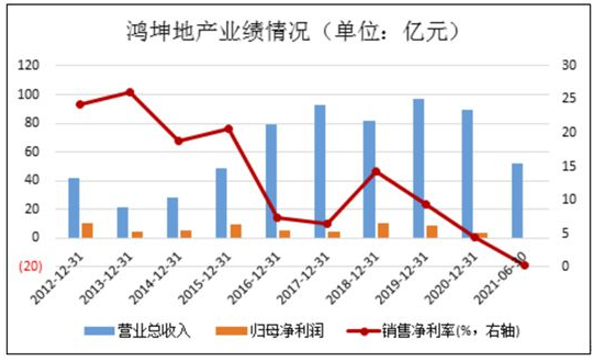 銷冠100說,鴻坤2020年的毛利潤只有500萬元。2021年上半年,鴻坤地產由盈轉虧,實現歸母凈利潤-6195.43萬元,同比減少約110.12%。毛利率為25.55%,同比下降53.47%。