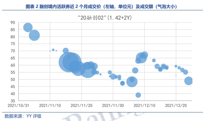 公開(kāi)信息顯示融創(chuàng)2021年12月有14億元ABS+1.5億元供應(yīng)鏈ABS到期,2022年一季度有35億元公司債+10億元ABS到期,此外訪談信息顯示一季度到期債務(wù)還有77億元貸款+20~30億元信托+境外融資4億元美金(有部分是質(zhì)押萬(wàn)達(dá)股票)。境內(nèi)活躍券“20融創(chuàng)02”成交凈價(jià)自10月底來(lái)一路下跌,12月初在一行兩會(huì)表態(tài)后有一波上漲,隨后繼續(xù)下跌,目前在49元左右。