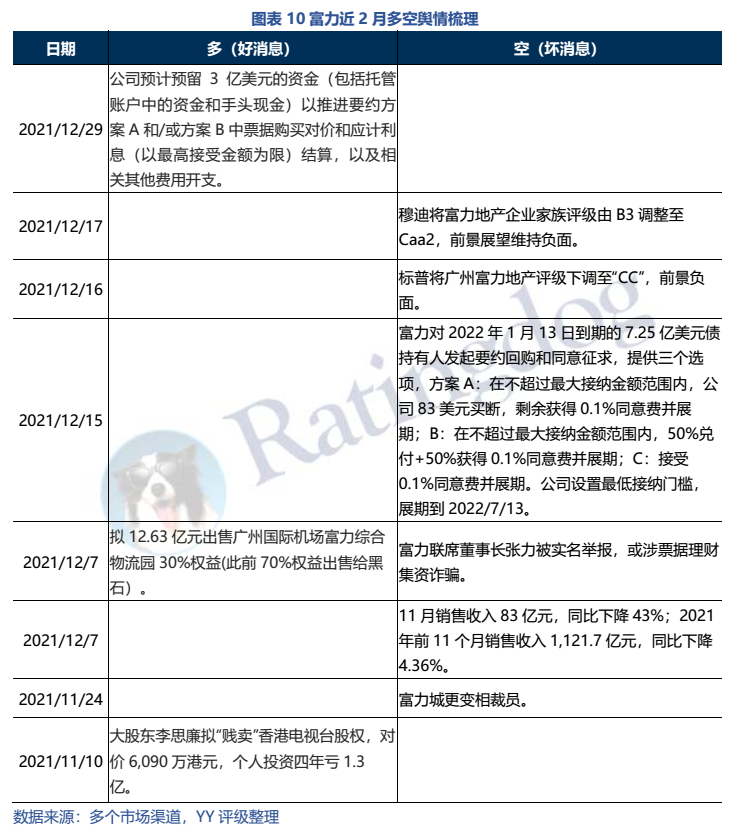 相較于今年暴露風(fēng)險(xiǎn)的民企,富力債務(wù)重壓?jiǎn)栴}盤亙已久,市場(chǎng)皆知,但公司仍通過(guò)銷售、資產(chǎn)出售和股東借款硬扛了許久,繼9月大股東將“倒賣”富力物業(yè)的收益借給公司后,12月公司以12.63億元清空了廣州物流園股權(quán)。面對(duì)行業(yè)下行及2022年1月到期的7.25億美元債,富力最終還是沒(méi)抗住,向持有人發(fā)起交換要約試圖將一部分債務(wù)展期支付。
