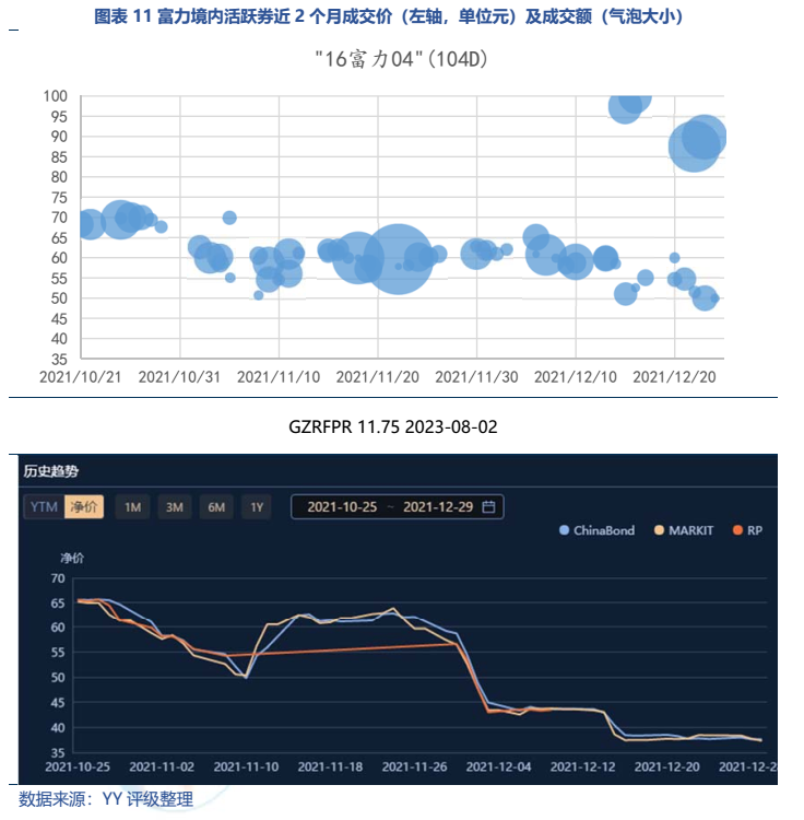 近兩月富力境內(nèi)活躍券“16富力04”價(jià)格從70元檔跌至50元檔,而境外10只存續(xù)債中有8只價(jià)格在30元檔,已反應(yīng)展期兌付的不確定性。