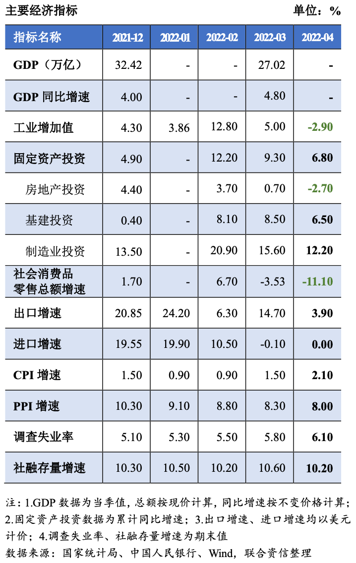 2022年4月,受國際環(huán)境更趨復(fù)雜嚴(yán)峻和國內(nèi)疫情沖擊明顯的超預(yù)期影響,我國多項(xiàng)經(jīng)濟(jì)數(shù)據(jù)大幅回落,經(jīng)濟(jì)新的下行壓力進(jìn)一步加大。生產(chǎn)端,4月工業(yè)和服務(wù)業(yè)生產(chǎn)同比均出現(xiàn)下降,長三角和東北地區(qū)工業(yè)生產(chǎn)受到較大沖擊,汽車制造業(yè)降幅超過30%。需求端,房地產(chǎn)投資增速轉(zhuǎn)負(fù),基建和制造業(yè)增速回落;消費(fèi)大幅降溫,出現(xiàn)兩位數(shù)的負(fù)增長,非生活必需品和餐飲銷售受疫情沖擊較大;國內(nèi)疫情疊加基數(shù)效應(yīng)使得出口增速回落幅度較大。價(jià)格方面,國際大宗商品價(jià)格上漲和國內(nèi)疫情影響推升物價(jià),中下游行業(yè)信用風(fēng)險(xiǎn)值得關(guān)注。疫情沖擊導(dǎo)致經(jīng)濟(jì)短期內(nèi)波動(dòng)較大,疊加國際形勢(shì)更趨復(fù)雜嚴(yán)峻,經(jīng)濟(jì)穩(wěn)增長壓力仍然較大。但同時(shí)也要看到,隨著局部疫情得到控制、逐步有序推進(jìn)復(fù)工復(fù)產(chǎn)以及擴(kuò)大內(nèi)需、助企紓困、保供穩(wěn)價(jià)、保障民生等一系列政策措施效果不斷顯現(xiàn),未來經(jīng)濟(jì)有望逐步企穩(wěn)。