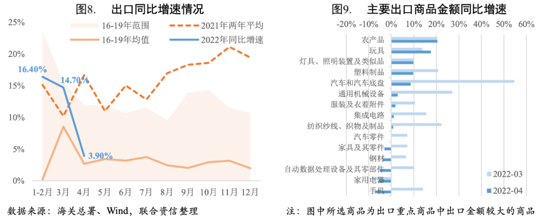 國內(nèi)疫情疊加基數(shù)效應(yīng)使得出口增速回落幅度較大,外需對(duì)經(jīng)濟(jì)的支撐作用減弱。2022年4月,我國出口2736.20億美元,進(jìn)口2225億美元,貿(mào)易順差511.20億美元。4月出口同比增速大幅下滑至3.90%,主要是在海外供給逐步恢復(fù)的同時(shí),國內(nèi)供給端以及出口貨運(yùn)受國內(nèi)疫情影響較大,疊加上年高基數(shù)效應(yīng)所致。主要出口商品方面,農(nóng)產(chǎn)品、玩具以及燈具等商品保持較高增速;汽車和汽車底盤、機(jī)械設(shè)備等商品出口金額增速大幅回落;手機(jī)、家用電器等商品出口額同比負(fù)增長。后續(xù)隨著供給端以及產(chǎn)業(yè)鏈的逐步恢復(fù),封控措施造成的貨物積壓和延遲到港等情況有望得到緩解,利好出口回升,但整體來看,2022年外需對(duì)經(jīng)濟(jì)的支撐趨于回落,穩(wěn)經(jīng)濟(jì)還要靠內(nèi)需發(fā)力。