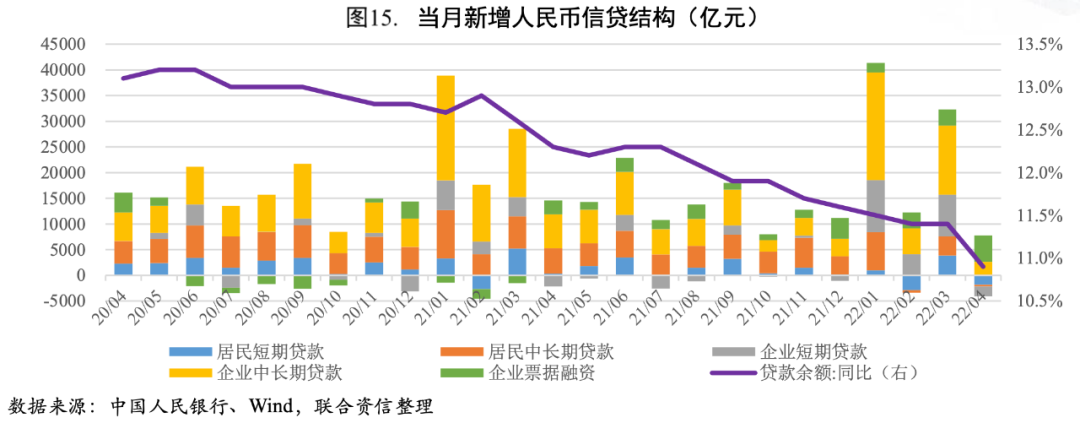 信貸總量走弱結(jié)構(gòu)欠佳,實(shí)體經(jīng)濟(jì)融資需求持續(xù)偏弱。4月金融機(jī)構(gòu)新增人民幣貸款6454億元,同比少增8231億元;4月末金融機(jī)構(gòu)人民幣貸款余額201.66萬億元,同比增長10.9%,增速分別比上月末和上年同期低0.5個(gè)和1.4個(gè)百分點(diǎn)。從結(jié)構(gòu)看,4月居民短期、中長期貸款新增規(guī)模均為負(fù),同比分別少增2221億元、5232億元,反映出受疫情沖擊和房地產(chǎn)市場(chǎng)預(yù)期弱化影響,居民消費(fèi)意愿和購房意愿依舊偏弱。企業(yè)中長期貸款同比少增3953億元,企業(yè)短期貸款、票據(jù)融資同比分別少減199億元、多增2437億元,顯示企業(yè)貸款結(jié)構(gòu)進(jìn)一步短期化。4月下旬以來票據(jù)轉(zhuǎn)貼現(xiàn)利率大幅下行,表明銀行票據(jù)沖量行為仍在延續(xù),反映出受疫情沖擊、要素短缺、原材料成本上漲等因素影響,企業(yè)特別是中小微企業(yè)經(jīng)營困難增多,有效融資需求明顯下降。后續(xù)看,隨著國內(nèi)疫情逐步緩和,疊加各類穩(wěn)增長政策提速發(fā)力,強(qiáng)化對(duì)重點(diǎn)領(lǐng)域和薄弱環(huán)節(jié)支持力度,實(shí)體經(jīng)濟(jì)融資需求好轉(zhuǎn),信貸總量及結(jié)構(gòu)或?qū)⒅鸩礁纳啤?/p>