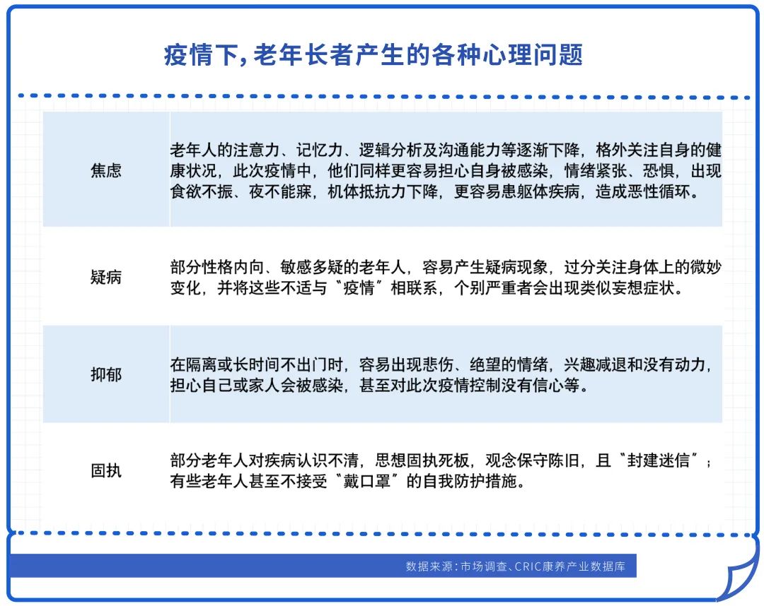 這些防控手段有效降低了感染風(fēng)險(xiǎn),也導(dǎo)致老人較普遍出現(xiàn)焦慮不安情緒,如焦慮、抑郁、孤獨(dú)、憤怒、多疑等。