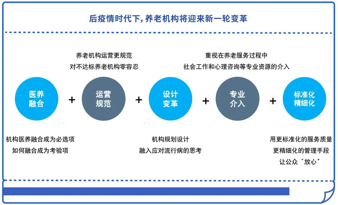 可以預(yù)見,后疫情時(shí)代下,養(yǎng)老機(jī)構(gòu)將迎來新一輪變革:醫(yī)養(yǎng)融合將成為標(biāo)配,養(yǎng)老機(jī)構(gòu)運(yùn)營將更加規(guī)范,機(jī)構(gòu)設(shè)計(jì)將融入流行病思考,各種專業(yè)資源將介入養(yǎng)老服務(wù)全過程,同時(shí)養(yǎng)老服務(wù)質(zhì)量與管理將更加標(biāo)準(zhǔn)化與精細(xì)化。
