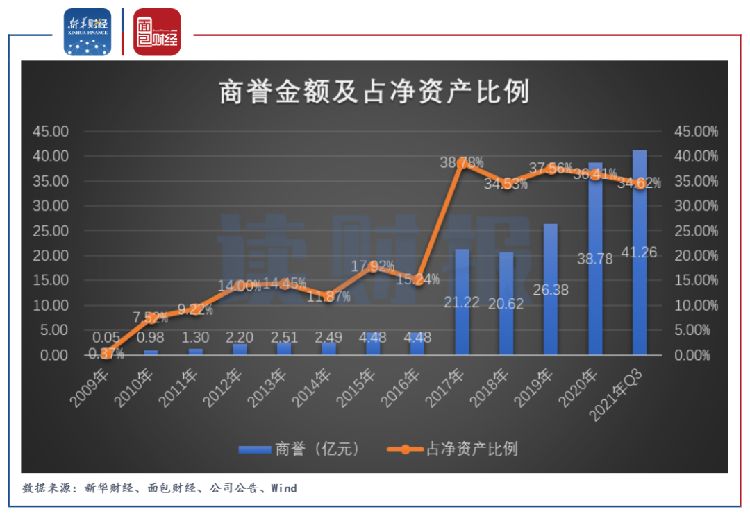 圖4:2009年至2021年Q3愛爾眼科商譽金額及占凈資產比例