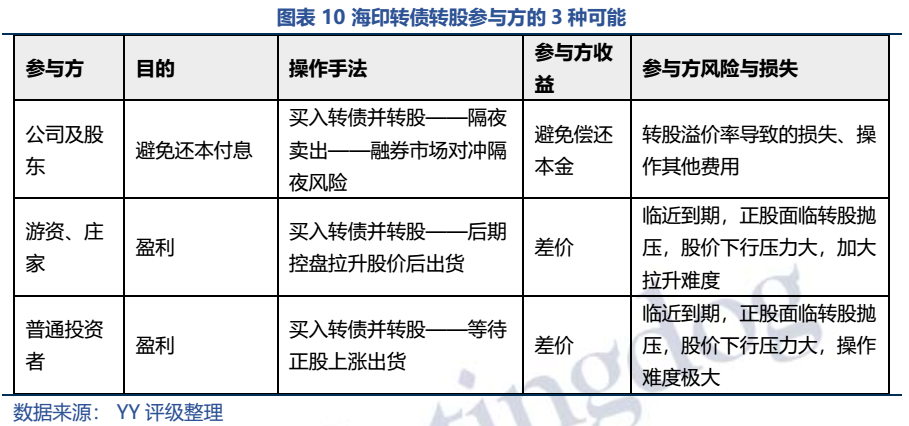 理論上,公司及大股東、游資及莊家、普通投資者都有轉股可能,但是:01海印轉債基本面較差,正股又面臨轉股拋壓,對于投資者而言轉股博弈價值極小;02如果是為了博弈盈利,沒必要同時進行融券對沖;03該操作最大的贏家是公司,可以減小違約困擾,又可以白嫖一大筆資金。