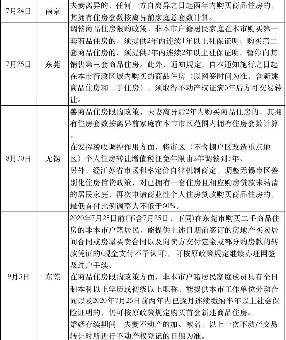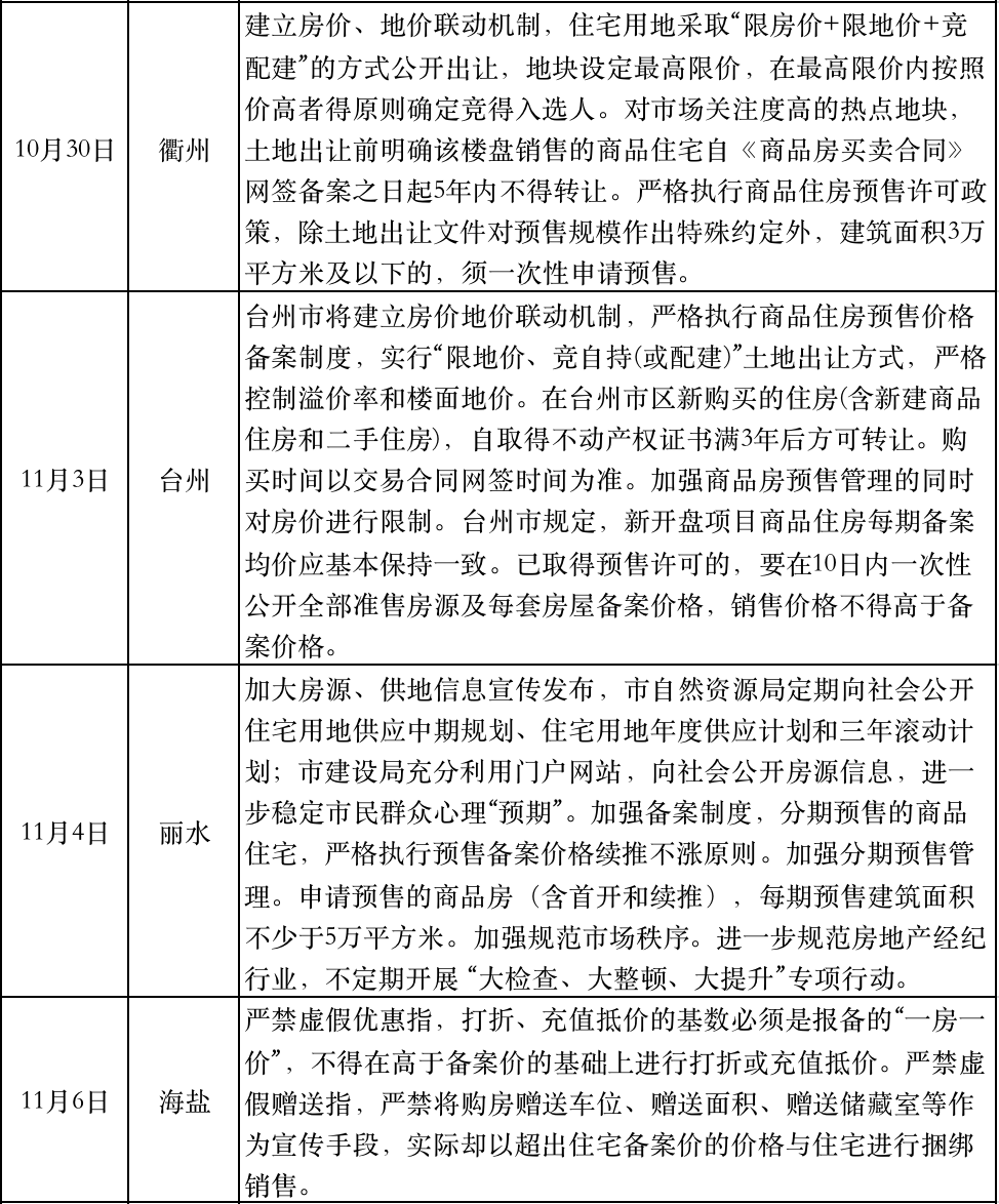 “十四五”規(guī)劃建議發(fā)布的同一天,浙江臺(tái)州升級(jí)了樓市調(diào)控,規(guī)定在臺(tái)州市區(qū)新購(gòu)買(mǎi)的住房(含新建商品住房和二手住房),自取得不動(dòng)產(chǎn)權(quán)證書(shū)滿3年后方可轉(zhuǎn)讓。麗水緊跟其后明確“四個(gè)加強(qiáng)”調(diào)控措施。
