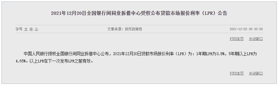 2021年12月20日,1年期LPR為3.8%,5年期以上LPR為4.65%。