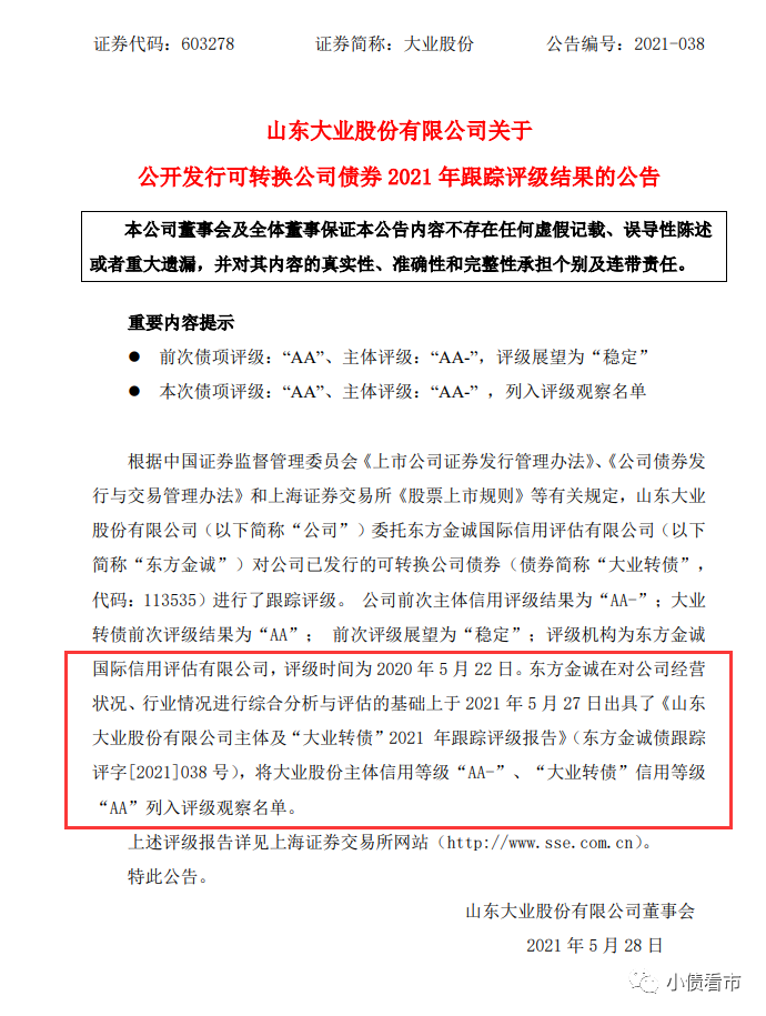 近日,大業股份(603278.SH)公告稱,東方金誠將其主體信用等級“AA-”、“大業轉債”信用等級“AA”列入評級觀察名單。