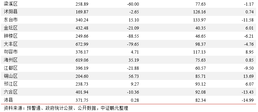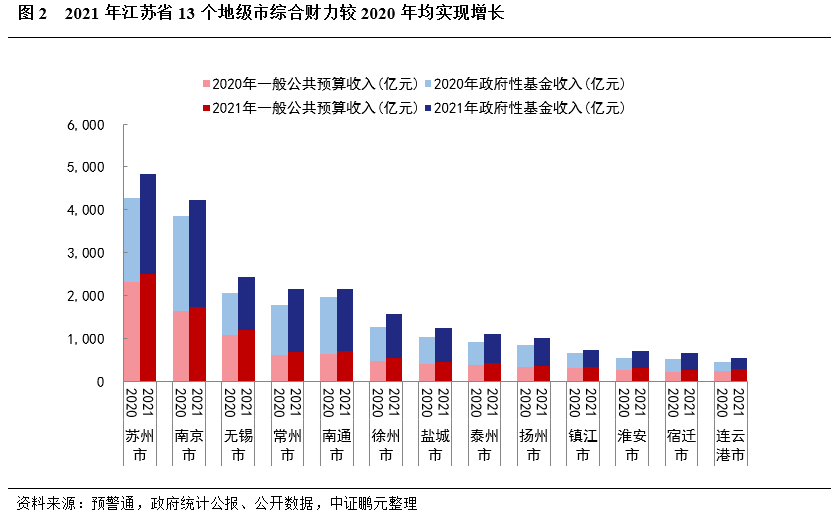 財(cái)政情況:2021年宿遷財(cái)政自給率大幅提高,95個(gè)區(qū)縣中有33個(gè)區(qū)縣財(cái)政自給率表現(xiàn)弱于去年。2021年江蘇省各地級(jí)市一般公共預(yù)算收入和政府性基金收入均較2020年有所提高,2021年宿遷財(cái)政自給率表現(xiàn)亮眼,較2020年提高8.28個(gè)百分點(diǎn)至45.80%,蘇州、南京、常州和無(wú)錫經(jīng)濟(jì)實(shí)力依舊較強(qiáng)、財(cái)政自給率依舊較高。區(qū)縣層面,2021年江蘇省絕大部分區(qū)縣一般公共預(yù)算收入和政府性基金收入均有所增長(zhǎng),昆山、江陰和江寧區(qū)一般公共預(yù)算收入仍穩(wěn)居頭部,但2021年邗江區(qū)一般公共預(yù)算收入下滑5.70億元至54.41億元,吳江區(qū)政府性基金收入下滑64.39億元至171.04億元,相城區(qū)、京口區(qū)、天寧區(qū)、吳江區(qū)和鐘樓區(qū)財(cái)政自給率較去年同期下降20個(gè)百分點(diǎn)以上。