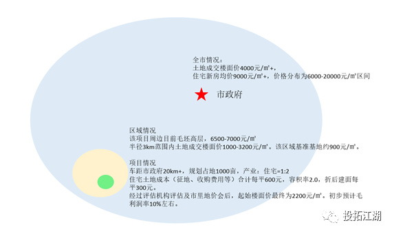 具體至該項目住宅地塊,基準地價約900元/㎡,土地成本(征地、收購費用等)合計600元/㎡,容積率2.0,即折后建面每平300元/㎡。經過評估機構評估及市里地價會后,確定掛牌的起始樓面價為2200元/㎡。
