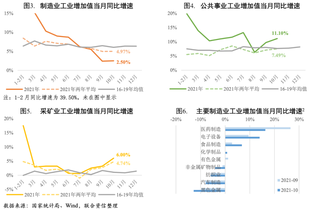 三大門類工業增加值同比增速均有所加快。2021年10月制造業工業增加值同比增長2.50%,增速穩中有升,兩年平均增速為4.97%,與上月持平,略低于2016-2019年同期均值水平;得益于能源保供政策發力、優質煤炭產能加速釋放,采礦業、電力、熱力、燃氣及水生產和供應業(以下簡稱“公用事業”)工業增加值同比增速和兩年平均增速均有明顯提升。